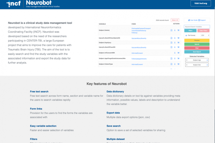 Neurobot is a clinical study data management tool developed by INCF. CENTER-TBI, a large European project that aims to improve the care for patients with Traumatic Brain Injury (TBI) is the first study using Neurobot and it was customised based on the feedback from researchers in the project.