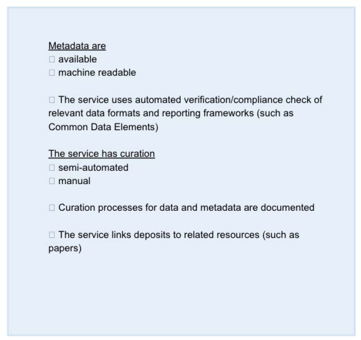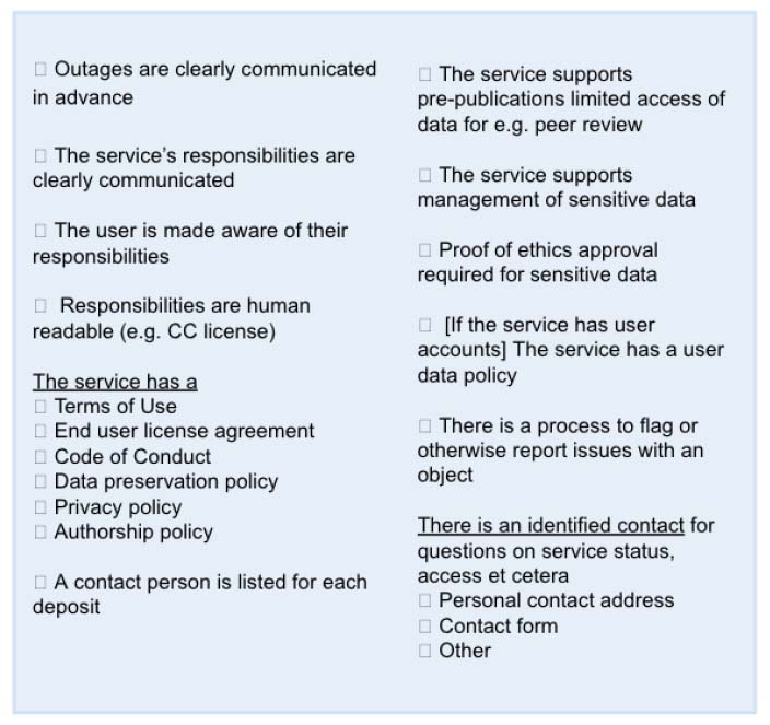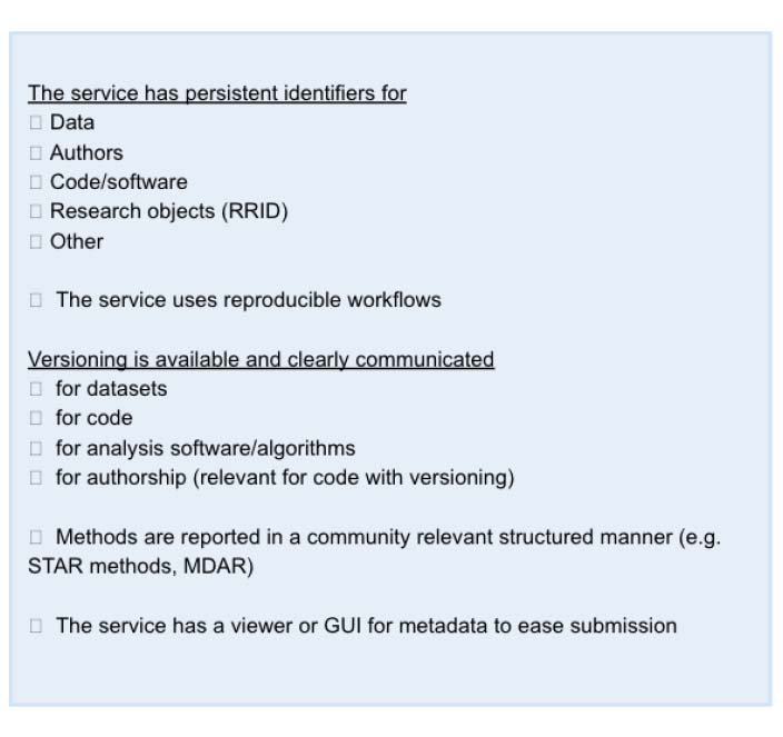 To this end, the INCF Infrastructure Committee has developed a set of recommendations and this checklist of associated criteria for choosing or setting up and running a repository or scientific gateway, intended for the neuroscience community, with a FAIR neuroscience perspective. The committee is aiming for an inclusive set of recommendations that can apply to a wide and diverse range of digital services, both repositories and science gateways, for data as well as software.