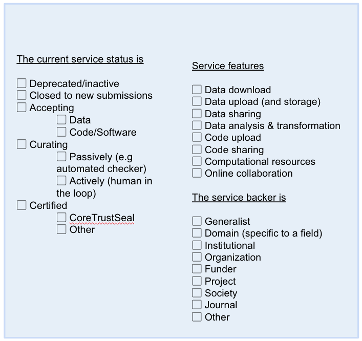 Repositories and science gateways are key resources for the neuroscience community, but users often have a hard time orienting themselves in the service landscape to find the best fit for their particular needs. On the other hand, service developers lack authoritative guidance to develop their platforms. INCF wants to help neuroscience researchers and students choose good services for their specific use cases; we also want to help service providers make good and future-proof decisions for setup and operations.