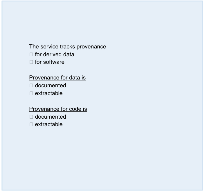 We recommend that provenance for data, derived data and software is documented and extractable.