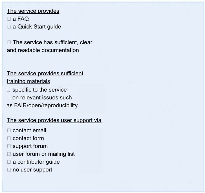 Providing user support is an essential criterium. We also recommend services to have specific resources to support new users, such as a FAQ or a Quick Start guide, and to make it possible for their user community to support itself via a forum or similar mechanism.